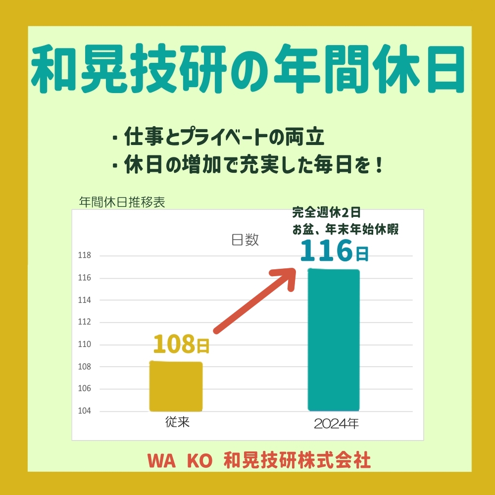 弊社では、会社として取り組む働き方改革の一環として2024年度より年間休日日数を従来の108日から116日に増加することにいたしました。