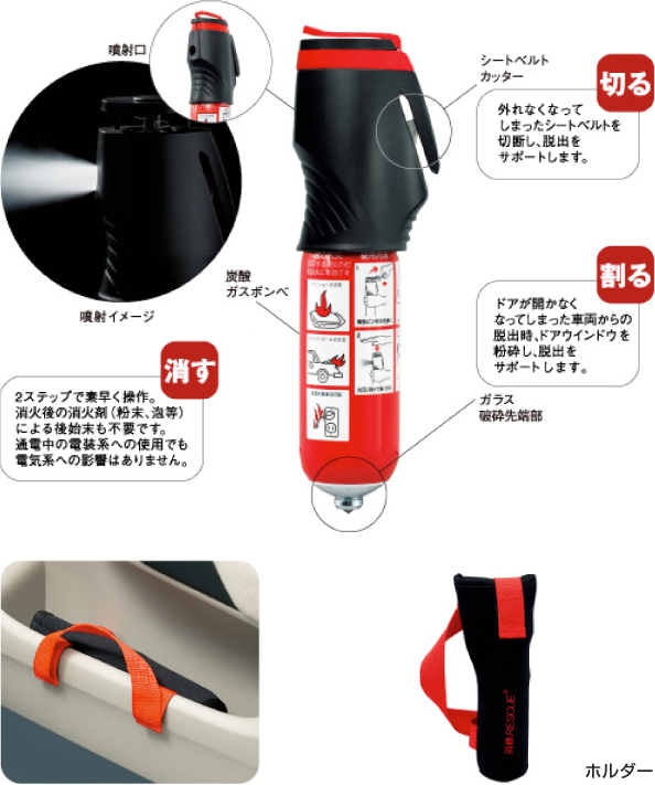 消棒RESCUEは一本で消火機能をはじめ、ドアウインドウを破砕するハンマー機能、シートベルトを切断するカッター機能を備えた、いざという時に頼もしいツールです。